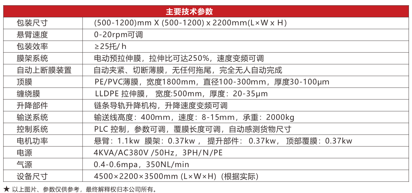 QS系列全自動懸臂纏繞覆膜包裝機是懸臂纏繞包裝機增加覆膜功能而成的集成一體式包裝設(shè)備,能夠完成纏繞包裝和頂膜覆蓋兩種功能,可將形成五面封閉的防潮、防雨、防塵的包裝體。實現(xiàn)無人化自動運行,效率高,包裝成本低,廣泛應用于食品飲料、化纖化工、冶金建材等行業(yè),是提高自動化程度的好設(shè)備。